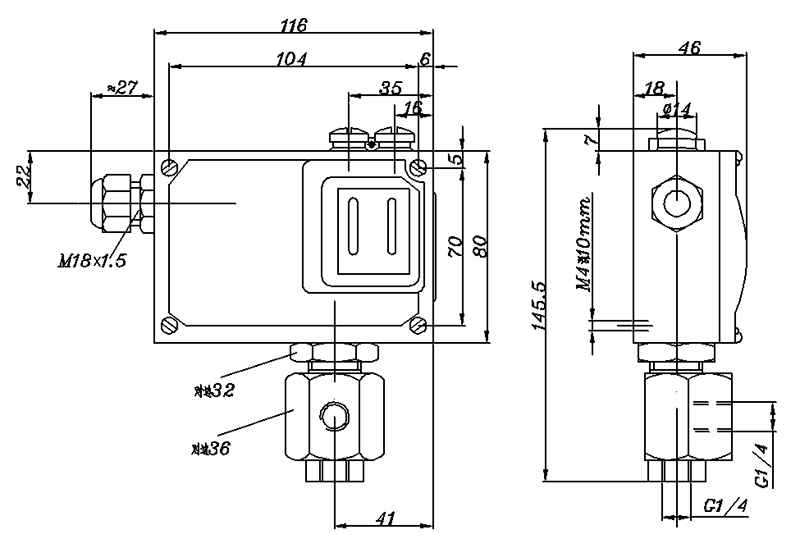 504/7D壓力開關外形尺寸及安裝尺寸(單位:mm)