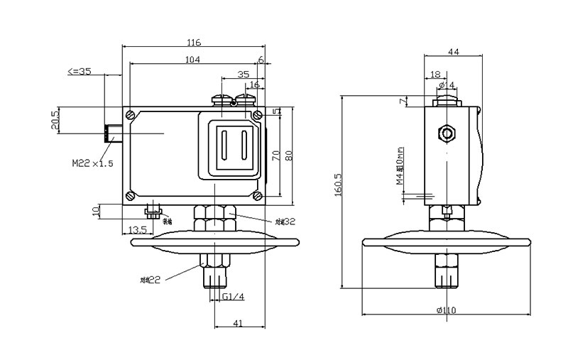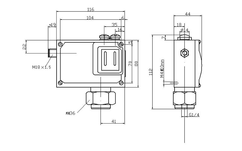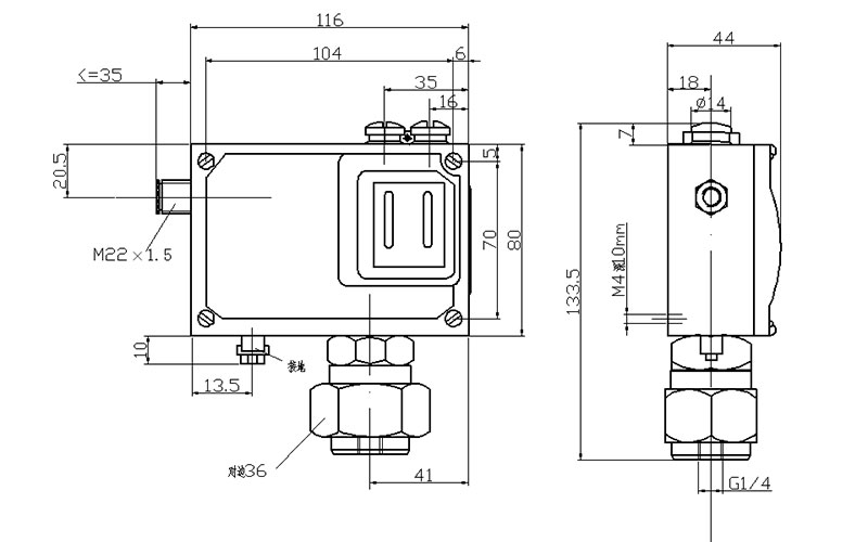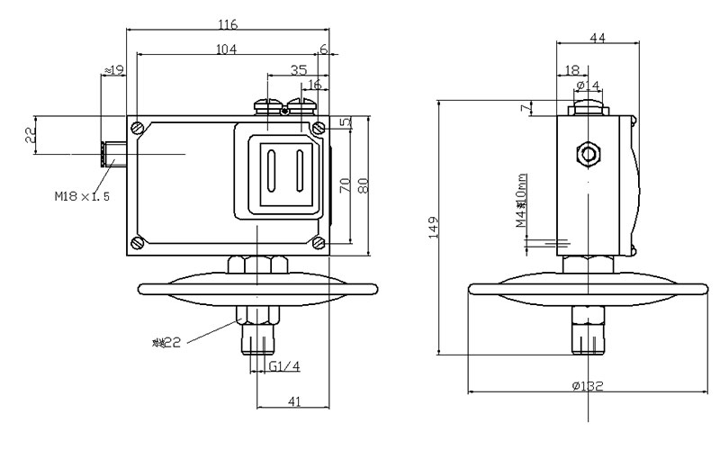 501/7D壓力開關(guān)外形尺寸及安裝尺寸(單位:mm)